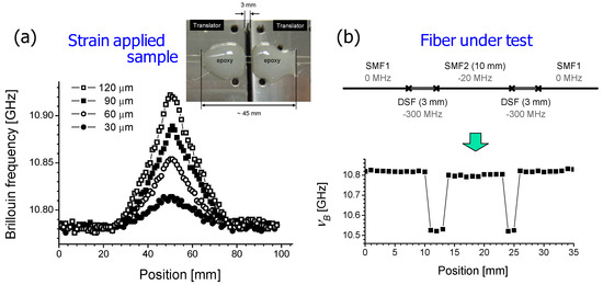 - Tanaka, M.; Hotate, K. Application of correlation-based continuous-wave technique for fiber Brillouin sensing to measurement of strain distribution on a small size material. IEEE Photonics Technol. Lett. 2002, 14, 675–677. [Google Scholar] [CrossRef]