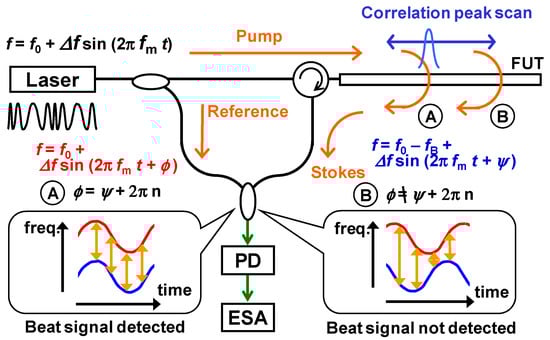 On the contrary, our group proposed and developed other ways of distributed measurement that can reduce the above-mentioned difficulties. These are called “Brillouin optical correlation-domain technologies” [8,9]. In the technologies, continuous lightwaves are utilized, whose interference or optical-coherence properties are synthesized to realize position selective measurement along the sensing fiber. This coherence manipulation technology was also proposed and developed in our group, which is called the “synthesis of optical coherence function (SOCF)” [13,14]
