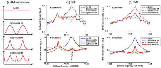 - Manotham, S.; Kishi, M.; He, Z.; Hotate, K. Simulation and experiment for verifying intensity modulation scheme in Brillouin optical correlation domain reflectometry. In Proceedings of the CLEO2012, San Jose, CA, USA, 6–11 May 2012; p. CM4B.3. [Google Scholar]