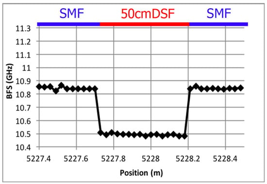In the time-domain technologies, there is an inherent limitation for the spatial resolution. When the launched pump pulse width is, for example, one meter, the spatial resolution is one meter. In this case, the pulsed lightwave has a broadened spectrum width of around 200 MHz, which is calculated in a simple Fourier analysis. On the other hand, the intrinsic BGS linewidth is around 30 MHz, as shown in Figure 17. This means that the accuracy in measuring the BFS shift is reduced, even when only the one-meter spatial resolution is required. Then, the time-domain configuration originally has the trade-off between the spatial resolution and the strain or temperature measurement accuracy.