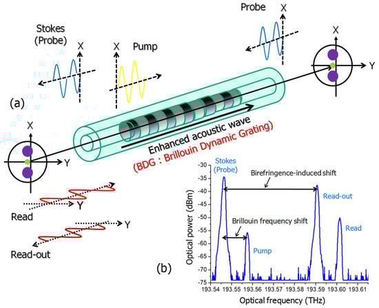 - Dong, Y.-K.; Chen, L.; Bao, X. Characterization of the Brillouin grating spectra in a polarization- maintaining fiber. Opt. Express 2010, 18, 18960–18966. [Google Scholar] [CrossRef] [PubMed]