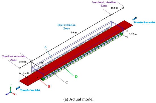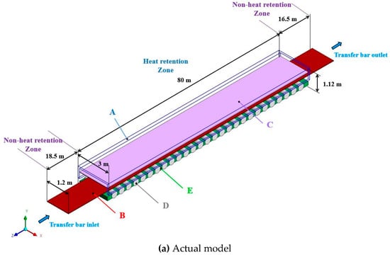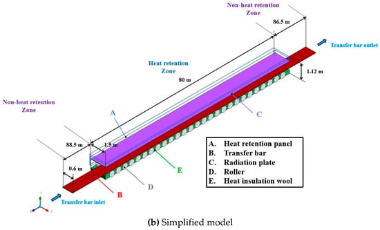 The traditional passive heat retention panel used in CSC has dimensions of 80 m (length) × 3 m (width) × 1.12 m (height). The schematic of the traditional passive heat retention panel is shown in Figure 2a. There are two temperature-measuring devices used to record the temperature of the transfer bars. One is located 3.5 m in front of the heat retention panel and labeled R2DT, and the other one is located 1.5 m behind the heat retention panel and labeled FET. The heat retention panel is divided into two zones, a non-heat retention zone and a heat retention zone. The transfer bars used in the study were stainless steel with dimensions of 70 m (length) × 1.2 m (width) × 0.03 m (thickness). In the process, the transfer bars are transported by the rollers beneath conveyors with various running speeds. The physical model is too large to perform the numerical calculation. Accordingly, the width of the heat retention panel and transfer bar are considered to be a one-half symmetric model in order to reduce the huge computational time required. Relatively, the running speed of the transfer bars were changed at different time intervals. The length of the transfer bars were assumed to be 85 m, so that it is would be convenient to calculate the location of the transfer bars. As shown in Figure 2b, the simplified three-dimensional heat retention panel has dimensions of 80 m (length) × 1 m (width) × 1.12 m (height) and the transfer bar has dimensions of 85 m (length) × 0.4 m (width) × 0.03 m (thickness). The properties of the heat retention panel, transfer bar, rollers, and heat insulation wool are listed in Table 1.