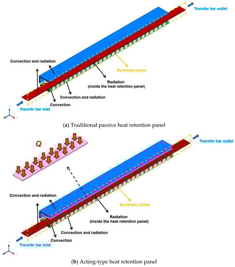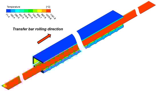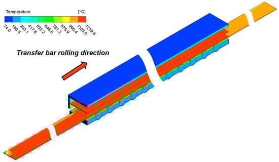 According to a hot rolling plant layout, Wang et al. [1] designed a space for installing heat retention panels. Bu [2] analyzed the hot rolling assembly line without a heat retention panel and discussed the influence of temperature at the finishing entrance. Furthermore, he analyzed the hot rolling assembly line with an installed heat retention panel. The results indicated that a heat retention panel can effectively decrease the temperature difference between the head and the tail of the transfer bar. Zhang et al. [3] utilized a two-dimensional simplified model to simulate a hot rolling assembly line, both with a heat retention panel and without a heat retention panel. They assumed the heat transfer mode of transfer bar in the heat retention panel to be based on radiation. Thus, they ignored the convective effect of air, and in order to simplify the computational calculation, the influence of the rollers beneath the conveyor was also ignored. Compared with the in-situ data in a steel plant, the results worked well for the prediction of the temperature history of the transfer bar. Zhang et al. [4] utilized a two-dimensional symmetry finite element method (FEM) to simulate the transfer bar inside a heat retention panel with a high radiation coating. They sprayed a high radiation ceramic coating on the inner wall of the panel. Their results showed that a high radiation ceramic coating can significantly decrease the temperature gradient in sections of the transfer bar.