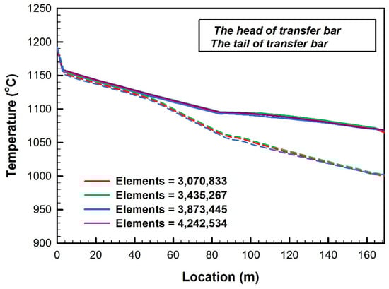 As shown in Figure 7, for the three-dimensional traditional passive heat retention panel model, four different grid numbers, 3,070,833 cells, 3,435,267 cells, 3,873,445 cells, and 4,242,534 cells, were tested for the time step of 0.5 s. The deviations in the transfer bar head for the four grid numbers were 1.22%, 1.04%, 0.91%, and 0.89%, respectively. Moreover, the deviations in the transfer bar tail for the four grid numbers were 1.31%, 1.13%, 1.06%, and 0.94%, respectively. The predicted results for the third grid and the fourth grid were almost the same. Thus, the third grid was adopted. It could also satisfy the requirements related to grid independence, computational accuracy, and computational time needed. The discretized system was solved iteratively until it satisfied the residual convergence criterion as follow: