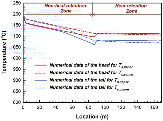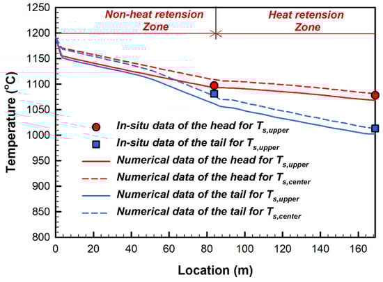 Figure 8 displays the temperature distributions of the transfer bar of numerical results and in-situ data from CSC. After the head of the transfer bar entered the heat retention panel (at the position of 90.02 m), it slowed down to 5 m/s at 139.22 m and then slowed down again to 2 m/s at 151.37 m. The residence time inside the heat retention panel of the tail is increased as the running speed of the head is decreased. This speed difference causes a temperature drop of the tail is larger than the head of the transfer bar. Eventually, the temperature difference is generated when the head and the tail reach the FET position. Figure 9 shows the temperature contours of the traditional passive heat retention panel model. It is obvious that the temperature difference was generated after the transfer bar passed through the heat retention panel. The local temperature contours of the heat retention panel, rollers, and the insulation wool are presented in Figure 10.