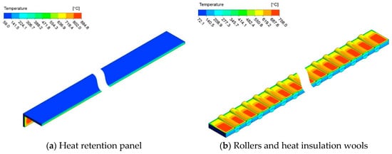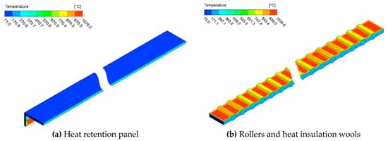 Table 3 shows that the numerical temperatures of the outer and inner wall of the heat retention panel were 114 °C and 711 °C, respectively. In addition, the numerical temperatures of the upper and lower surface of the rollers were 622 °C and 238 °C, respectively. As mentioned above, all the numerical temperatures of the heat retention panel and the rollers matched the in-situ data provided by CSC.