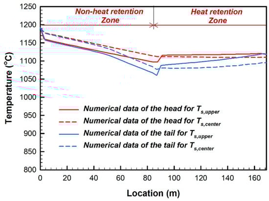 To validate the numerical models developed in this study, the results of the transfer bar for the traditional passive heat retention panel model were compared with the in-situ data provided by CSC, as shown in Table 2. The in-situ temperatures were obtained with R2DT and FET tests by measuring the upper surfaces of the transfer bar when it was passing through the traditional passive heat retention panel. R2DT is the abbreviation of the temperature detector near the roughing mills and FET is the abbreviation of the temperature detector near the finishing mills. Table 2 shows that the in-situ temperature of the head was 1097 °C as measured using the R2DT, and the numerical temperature was 1092.78 °C. The deviation between the in-situ and the numerical temperature was approximately 0.38%. The in-situ temperature of the head was 1078 °C as measured using the FET, and the numerical temperature was 1068.24 °C. The deviation between the in-situ and the numerical temperature was approximately 0.91%. The in-situ temperature of the tail was 1081 °C as measured using the R2DT, and the numerical temperature was 1061.55 °C. The deviation between the in-situ and the numerical temperature was approximately 1.79%. The in-situ temperature of the tail was 1013.33 °C using the FET, and the numerical temperature was 1002.58 °C. The deviation between the in-situ and the numerical temperature was approximately 1.06%. As mentioned above, the numerical temperature difference in the head and the tail was 65.66 °C, which is close to the in-situ temperature, 64.67 °C.