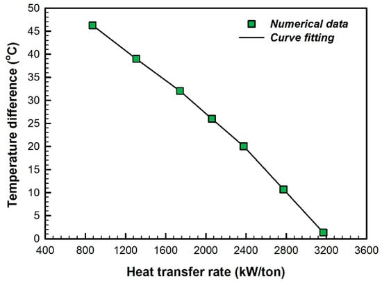 Figure 14 shows the temperature distributions for Case 2. When the heat flux was increased to 840 kW/m2, the temperature difference at the FET position was reduced to 1.97 °C. The temperature distribution of the tail rose more intensely compared with Case 1. Meanwhile, the temperature values of the inner walls inside the heat retention panel and the upper surfaces of the rollers rose to 1329.4 °C and 791.58 °C, respectively. Generally, the unit of heat used in the steel industry is kW/ton, which refers to the amount of fuel required to raise each ton of steel by one degree. In this study, the heat flux 462 kW/m2 and 840 kW/m2 were converted to 1743.47 kW/ton and 3169.94 kW/ton, respectively. Meanwhile, Figure 15 shows the relationship between the amount of fuel required and the temperature difference, which is helpful for steel plants to determine how much fuel will be used when using the acting-type heat retention panel.
