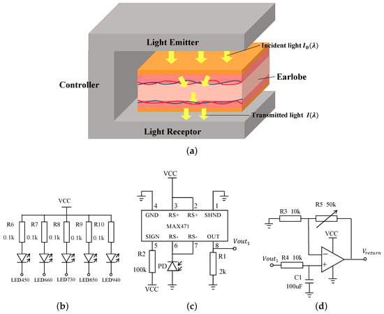 Earlight is the blood glucose sensor used in this paper for collecting absorbance data of different wavelengths. In this section, we focus on the circuit design of the Earlight, which is composed of three parts, i.e., light emitter, light receptor, and controller, as shown in Figure 2a.