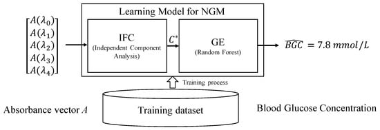 In this paper, a learning NGM model that can overcome IDs, to a certain extent, is presented. This model is based on human earlobe light absorbances with five different wavelengths and a glucose estimating algorithm with automatically parameters tuning for individuals. The earlobe was chosen due to the absence of bone tissues, and also because of its relatively small thickness [16]. We choose three wavelengths (, and 930 nm) in the near infrared wavelength range whose absorbance mainly depends on the amount of glucose in blood to measure blood glucose level. In order to overcome the IDs, green (490 nm) and red (660 nm) light is used to estimate the tissue thickness and blood volume separately to compensate the measurements [12]. Based on the linear relation between absorbances of the five lights and blood components, we use Independent Component Analysis (ICA) [17] to extract independent components from transmittances data, and use them as new features data. Glucose concentration is obtained with Random Forest (RF) [18], and test its performance with a reference invasive glucose meter in terms of measurement accuracy. ICA is a method for separating complex signals to independent signals by matrix decomposition which is frequently used in signal processing [17]. RF is a machine learning model, which can be used for black-box modeling in the case of mechanism is not clear [18]. Prototype test result shows the effectiveness of this approach by Clarke Error Grid Analysis (EGA) [19].