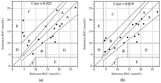EGA is designed to quantify clinical accuracy of blood glucose estimates generated by meters as compared to a reference value [19]. The grid breaks down a scatterplot of a reference glucose meter and an evaluated glucose meter into five regions. The meanings of each region are listed in Table 4.