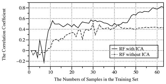 The second part of the comparative experiments, like accuracy and convergence experiments, is designed to compare the accuracy of different regression methods with or without ICA. First, randomly select 80% of samples from the dataset acquired from subject #1 as training dataset, and the other 20% of samples is used as testing dataset. Secondly, training various regression methods with the best parameters acquired from the first part of this experiment. Thirdly, calculate the accuracy () as the same way in accuracy experiment. Finally, draw the convergence curves of different models. In Table 2, column 4 has listed the best of different regression methods, and their required number of samples in the training set that can make reach to 0.5 and the best are listed in column 5 and 6 respectively. It can be noted that using RF with ICA model, it takes 60 times to train the algorithm to achieve an accuracy of , which means that each patient should prick himself/herself 60 times to inform the algorithm with his/her 60 blood concentration levels before performing non-invasive measurements. Still, this is twice as fast as ’s 100 times of training.