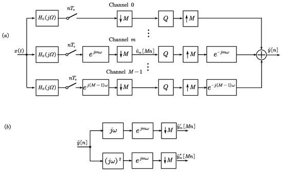 The model of an M-channel time-interleaved analog-to-digital converters (TIADC) with bandwidth mismatches. (The “” module is a down-sampler of factor M, while the “” module is an up-sampler of factor M. The “Q” module is the quantizer.)