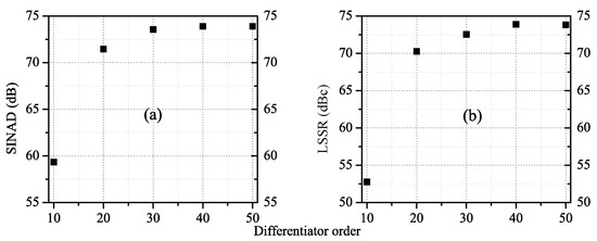 In the first case, the effect which the differentiator order has on the algorithm performance is surveyed. Simulation parameters except the differentiator order are set as Table 3. The results are depicted in Figure 11. One can achieve better SINAD and LSSR along with higher differentiator’s order. A 40-order differentiator is enough when the mismatch coefficient is below 0.2 and input spectrum occupies the lower fraction of the Nyquist band. Moreover, the differentiator’s order also has a connection with its pass-band (PB) width. For example, a 20-order differentiator is enough if the input signal only occupies the lower fraction of the Nyquist band.