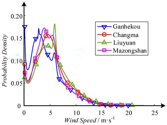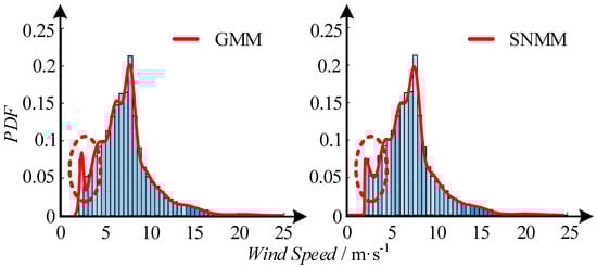 In non-sequential models, the most commonly used paradigm is the Weibull distribution, which can be given by two parameters. The utilization of Weibull distribution was also reported in [12,13], which aimed at estimating wind energy resources, wind power forecasting, and so on. However, individual distribution, such as the Weibull and Rayleigh–Rice distributions, can hardly be suitable for capturing the characteristics of wind speed under various topographical and climatic conditions. Therefore, the focus of recent researchers has shifted to applying mixture distributions to fit the distribution of wind speed, among which the Gaussian mixture model (GMM) is typical. Ke, Chung and Sun in [14] proposed a customized GMM to deal with the discontinuities of the PDF, based on which a novel probabilistic optimal power flow model was established. GMM was also combined with neural network to forecast short-term wind power generation in [15].