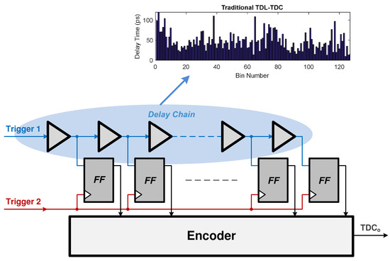 Time-to-digital converters (TDCs) are vital components in numerous scientific applications, such as positron emission tomography (PET) [1,2,3,4,5,6], time-of-flight (ToF) image sensors [3,4,5,6,7], and light detection and ranging (LiDAR) [8,9,10]. Especially in ToF imaging and LiDAR applications, high-resolution TDCs affect overall performance. Field programmable gate array (FPGA)-based TDC designs have become notably popular thanks to their programmability and the short times required to generate designs [11,12,13,14,15,16,17,18,19,20,21,22]. The tapped delay line (TDL) is the simplest FPGA-based structure in TDC designs. Time resolution and linearity are crucial to FPGA-based TDCs; however, the dedicated elements used in FPGAs often result in a lack of uniformity in delay cells, which in turn can undermine time linearity [12]. Therefore, a great deal of research has gone into the development of calibration methods to overcome nonuniform cell delay in FPGA-based TDL-TDCs [13,14,15,16,17,18,19,20,21,22].