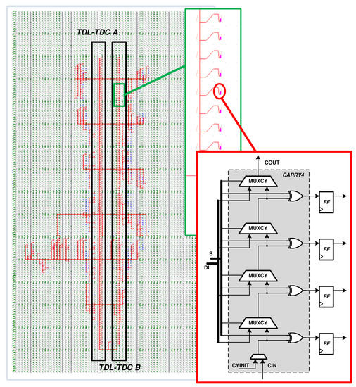 Based on Equation (5), the time conversion can be obtained according to the hit distribution of each cell, which is called the code density statistical calibration. Because the statistical bin calibration requires considerable time to obtain the time distribution of each delay cell in the chain, two delay lines are adopted in the proposed DDL-TDC to reach run-time calibration. Thus, the calibration can alternate between these two delay lines. These two delay lines are assigned to dedicated fast lookahead carry logic, referred to as CARRY4 cells in the Xilinx Vertix-5 FPGA [32], in two vertical lines by using the commands RLOCand LOC of the Xilinx ISE 14.7 software (XilinX Int., San Jose, CA, USA) tool. The dedicated fast lookahead carry logic (CARRY4) has a small time delay in the Vertix-5 FPGA logic resource, which can obtain higher time resolution than other logic resources. In each CARRY4, four delay cells are implemented, and 512 delay cells are allocated in each vertical delay line. Figure 2 illustrates the layout of the two delay chains in the FPGA chip and the details of the CARRY4 cells.