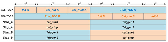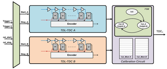 Figure 5 illustrates the timing diagram of the proposed DDL calibration. In the beginning, the TDL-A takes cycles to reset Cal_Mem A and then uses 131,072 cycles to count the hits of code density testing in the Cal_Run state of the TDL-A calibration FSM. Finally, TDL-A uses cycles to obtain the calibration map and stores the parameter in Cal_Mem A. For these () cycles, TDL-TDC A executes calibration, and TDL-TDC B runs the time conversion at the same time. The operation changes for the next () cycles; in those cycles, the TDL-TDC A runs time conversion, and the TDL-TDC B executes calibration. As TDL-TDC A executes the calibration, cal_start and cal_stop connect to Start_A and Stop_A; the input signals Trigger 1 and Trigger 2 connect to the input signals of TDL-TDC B (Start_B and Stop_B). In this work, we chose 6 ns as our clock period. Thus, the calibration time of TDL-TDC A is ns = ns 0.8 ms. In this 0.8 ms, TDL-TDC A executes the calibration, and TDL-TDC B runs the time conversion. However, in the next 0.8 ms, TDL-TDC B executes the calibration, and TDL-TDC A runs the time conversion. Consequently, the proposed DDL-TDC performs calibration every 0.8 ms. This time is short enough to adapt to changes in the environment; the ongoing conversion is suitable for ToF LiDAR applications.