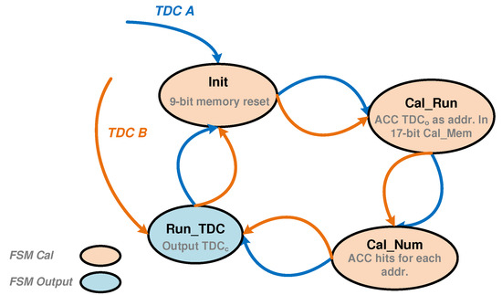- Cal_Run: Code density counts are run in this state to calibrate the time distribution corresponding to the delay line that will be calibrated. For this, counts are run for the Cal_Run state to obtain the time distribution based on the code density test scheme [33].