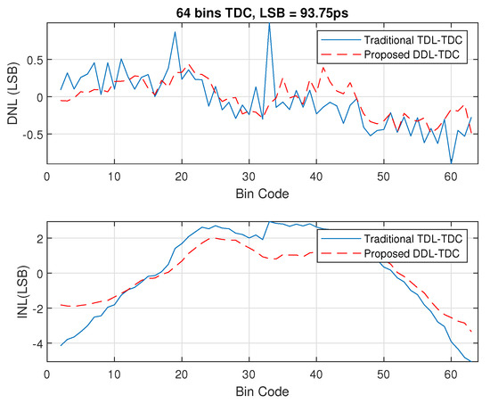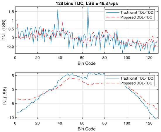 The proposed DDL-TDC output 7-bit ~ 5-bitdigital code over a conversion range of 6 ns, such that the least significant bit (LSB) of the DDL-TDC was 46.875 ps (= 6 ns/128) ~ 187.5 ps (= 6 ns/32). Figure 7, Figure 8 and Figure 9 compare DNL and INL values from a traditional TDL-TDC (without any calibration) and from the proposed DDL-TDC (with real-time calibration) for the LSBs of 46.875 ps, 93.75 ps, and 187.5 ps, respectively. The ranges of DNL and INL values were and for ps, and for ps, and and for ps. Table 3 shows the linearity improvement of the DDL-TDC compared with the TDC-TDC, which is presented as percentages without any calibration. The DDL-TDC clearly outperformed TDL-TDC in terms of INL and DNL. These results clearly demonstrate the efficacy of DDL-TDC in terms of time linearity.