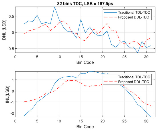In addition, the proposed DDL-TDC achieved high-resolution and high-linearity measurements. Thus, the time conversion range was only 6 ns, but a 32-ps resolution time was achieved for high-resolution measurements. The DDL-TDC could be augmented with an additional coarse counter to increase the conversion range for some applications that might require larger conversion range measurements. However, the fine time measurements would still use the DDL-TDC to maintain the high-resolution measurements.