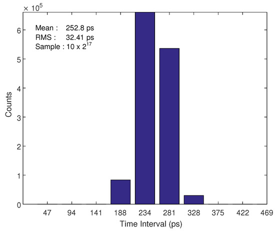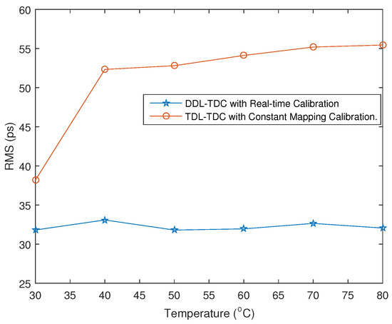 To verify the time resolution of the proposed DDL-TDC, a constant time interval was fed as Trigger 2, which was constantly delayed by the Trigger 1 signal. Figure 10 presents the histogram of the measured data after performing measurements of the constant delay time. The measured mean time was 252.8 ps, and the RMS value was 32.41 ps. Thus, the single-shot precision of DDL-TDC was 22.9 ps = 32.41 ps. For various temperatures, Figure 11 also illustrates the RMS values for real-time calibration TDC (DDL-TDC) and for the TDL-TDC with a constant mapping calibration table in software. The proposed DDL-TDC exhibited considerable robustness against fluctuations in temperature, as indicated by the RMS values in Figure 11. Consequently, the proposed DDL-TDC not only improved DNL and INL performance but also achieved high-resolution measurements in an FPGA-based TDC design.