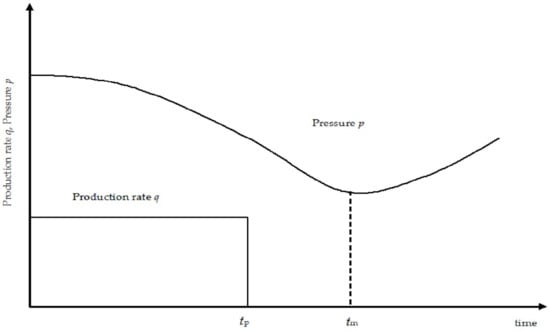 The continuously differentiable function p monotonically decreases in the region [0, max (tp, )], and monotonically increases in the region . Therefore, there must be a point when the pressure p of Well B reaches a minimal value. According to the extremum condition of a function,