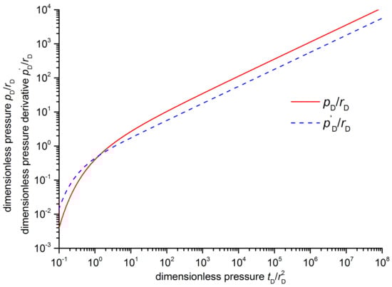 In Equation (36), the variable rD that replaces the variable xD is the distance between the active well and the observation well along the fracture. The curves of the dimensionless pressure derivative denoted in Equation (36) and the dimensionless pressure denoted in Equation (26) are drawn in one type-curve as Figure 3. This finding can be observed in the double logarithmic coordinate system, when the distance between wells is constant, the pressure and pressure derivative increase over time, and the speed of increase approaches a constant. Both of the two curves become linear with a slope of 0.5.