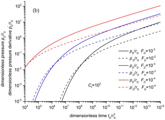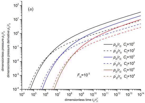 Different connection forms and boundary conditions also reflect their characters in the interference test type-curve. For two wells connected by a homogeneous reservoir, the dimensionless pressure derivative increases and then approaches a 0.5 horizontal line [38]. Therefore, the shapes of their dimensionless pressure derivative curves are highly different. The pressure derivative would appear between the 0.5 horizontal lines and the straight line with a slope of 0.5, when the difference between the conductivity of the large fracture and the matrix is not large enough to ignore the influence of the matrix. Considering the crossflow of the reservoir matrix to the large fracture, the pressure transient can be obtained through Laplace transformation and the Stehfest numerical inversion method. The details can be seen in the Appendix A. The interference test type-curve of WsCLF with a crossflow of reservoir matrix is shown in Figure 5. It can be seen that the pressure and pressure derivative curves approach parallel straight lines with a slope of 0.25. It can be found that FD and Cf have a similar influence on the curves, and they cannot be distinguished. This can also be concluded from Equation (A19).