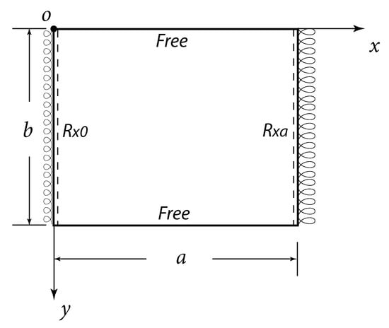 A considerable amount of literature has been published on analytical solutions for vibration of orthotropic plates with classical boundary conditions such as simply supported, clamped, and free [1,2,3,4]. In parallel, vibration of rectangular plates with elastically restrained edges has attracted considerable attention since the 1950s [5,6,7,8,9,10,11]. These studies focused primarily on the approximate estimation of natural frequencies by using Rayleigh method and Ritz method. Furthermore, most studies were devoted to isotropic plates with elastically restrained and simply supported edges. Limited research has been conducted to study orthotropic plates with elastically restrained and free edges. Laura and his colleagues [12,13] investigated orthotropic plates with three edges elastically restrained and the fourth edge free (i.e., R–R–R–F) and two adjacent edges elastically restrained and the other adjacent edges free (i.e., R–R–F–F) by Rayleigh method. Similarly, orthotropic plates with the edges elastically restrained against rotation and a free, straight corner cut-out was studied in [14]. The results reported in these three works are limited to the fundamental frequency. Grace and Kennedy [15] studied the dynamic response of orthotropic plate having clamped-simply supported and free-free boundary conditions (i.e., C–F–S–F). Liu and Huang [16] directly extended the semi-analytical finite difference method reported in [8] to free vibrations of orthotropic plates with elastically restrained and free edges. Some eigenvalues for R–F–R–F orthotropic plates have been reported. On top of that, to the best knowledge of the authors, no exact analytical solution is currently available for transverse vibration of R–F–R–F orthotropic plates.