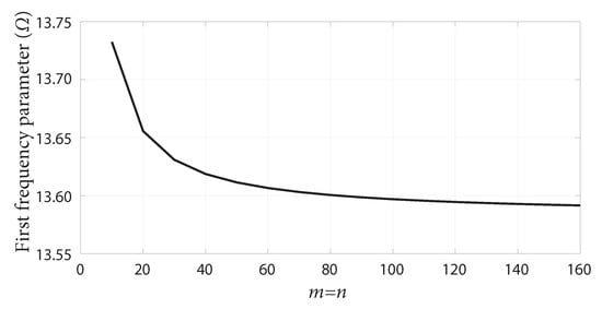 First of all, the convergence of the fundamental frequency parameter is shown in Figure 2 for the case of a square R–F–R–F isotropic plate with . The values are examined by truncating the series up to since the computation time becomes very long on a standard personal computer when . From the results of the convergence study, the number of series terms N is taken to be 100 for all numerical results presented herein.
