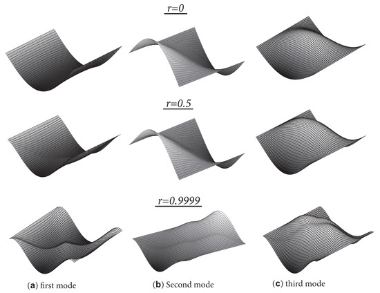At last, the influence of different degrees of rotational restraints on the mode shapes was investigated. Figure 3 shows the first, second and third mode shapes of R–F–R–F orthotropic square plates with three different values of rotational fixity factors (0, 0.5 and 0.9999). The mode shapes can be found to be significantly altered by the rotational restraints.