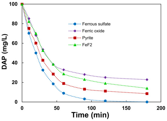 Thus, the optimum [H2O2]/[Fe2+] mass ratio for Fenton oxidation of DAP at pH 3.2 was 20 confirming the need for Fe2+ doses, which was much too less than the stoichiometric dose as reported by several studies [24,31]. To compare the effect of the catalyst source on degradation of DAP by the Fenton process, a series of experiments were performed using a fixed concentration of DAP of 100 mg/L and a dose of H2O2 of 1000 mg/L at pH 3.2, and 50 mg/L Fe2+ obtained from different sources. Four iron sources (ferrous sulfate, ferric oxide, pyrite and FeF2) were supplied during DAP degradation by Fenton reaction. The results of these experiments are presented in Figure 4. This figure shows that the DAP concentration decreased from the beginning of treatment by the Fenton process for all iron sources. However, in the presence of ferrous sulfate, the DAP degradation yield was higher than that obtained with the addition of ferric oxide, pyrite or FeF2. The complete DAP degradation was observed only when ferrous sulfate was used as a source of iron after 180 min. DAP degradation yields were 100%, 91.49%, 85.98% and 77.17% for ferrous sulfate, pyrite, FeF2 and ferric oxide, respectively. The results confirm that DAP degradation is affected by the iron source. Consequently, DAP degradation is significantly favored by homogeneous catalysis when Fe2+ is available in a soluble form than heterogeneous catalysis when an insoluble source of iron is used.