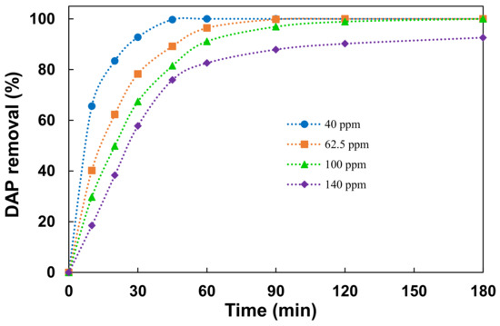 The pollutant concentration is an important parameter in wastewater treatment. To evaluate the influence of this parameter on the efficiency of the oxidation process the pH was fixed at 3.2 keeping [H2O2]/[Fe2+] and [H2O2]/[DAP] mass ratios equal to 20 and 10, respectively. The effect of DAP concentration in the range 40–140 mg/L is presented in Figure 6. This figure indicates that the DAP degradation yield achieved more than 92% after 120 min for all DAP concentrations. The increase of DAP concentration from 40 to 140 had no significant effect on DAP degradation yield by Fenton oxidation. The lower the DAP initial concentration, the shorter the reaction time needed to completely degrade DAP. For example, the DAP degradation yield decreased from 99.7% to 75.9% with an increase in DAP concentration from 40 to 140 mg/L after 45 min. This decrease in degradation rate may be due to the competitive reactions between •OH and the intermediates formed during DAP degradation by Fenton oxidation.