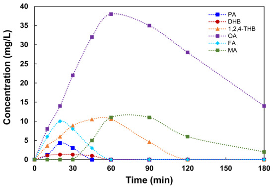 On the basis of the results above, the oxidative degradation of DAP by the Fenton process was accompanied by the formation of aromatic and aliphatic intermediate products. For this reason, it is very important to identify the main intermediates. Their identification was carried out by HPLC analyses. Figure 9 presents the evolution of the concentration of the aromatic and aliphatic intermediates with time during the treatment of aqueous solution containing 100 mg/L DAP by the Fenton process using 1000 mg/L H2O2 and 50 mg Fe2+/L and at pH 3.2. This figure shows that phthalic acid (PA), 1,2-dihydroxybenzene (DHB) and 1,2,4-trihydroxybenzene (THB) were the main aromatic intermediates identified during the oxidation of DAP by the Fenton process. These three intermediates (PA, DHB and THB) are clearly formed from the beginning of the treatment of DAP (about 5 min). A maximum concentration of 4.3 ppm phthalic acid (PA), 1.3 ppm 1,2,4-trihydroxybenzene (THB) and 10.6 ppm 1,2-dihydroxybenzene (DHB) were found, and then completely removed in 45, 60 and 120 min of treatment, respectively. This result indicated the opening of the aromatic ring and the generation of aliphatic intermediates. Maleic, formic and oxalic acids are the detectable aliphatic intermediates of DAP oxidation by the Fenton process (see Figure 8). The formation of maleic acid appeared after 30 min of treatment, attaining a plateau concentration of about 11 mg/L after around 45 min of treatment and then decreasing to very low values (2 mg/L) after 120 min treatment. Formic acid starts its formation at the beginning of treatment, reaches its maximum concentration of 10 mg/L and then completely disappears after 45 min. On the other hand, oxalic acid was, as expected, the major and most persistent carboxylic acid generated. The concentration of oxalic acid increased rapidly at the starting of treatment. The highest concentration of oxalic acid was quantified as 38 mg/L at 60 min of the treatment. After that time, the amount of oxalic acid gradually decreased to a value of 14 mg/L at the end of the treatment. Consequently, these six intermediates were more or less quickly oxidized into CO2 and H2O, and quasi-completely mineralized after about 180 min of treatment.