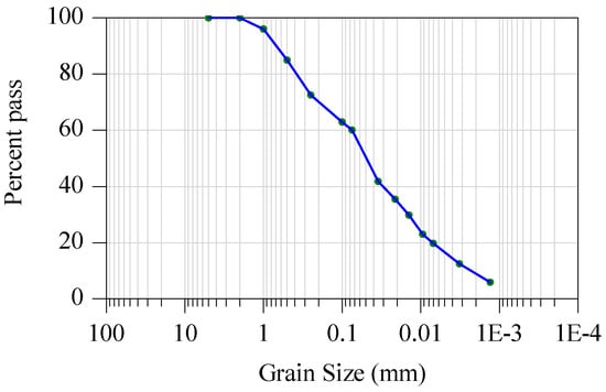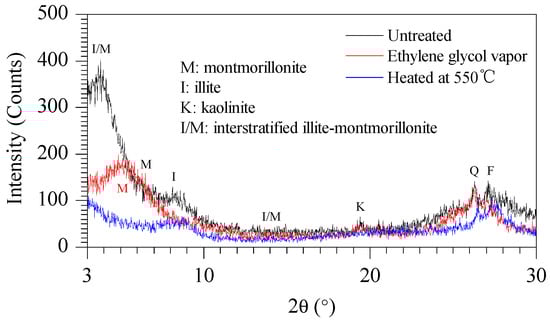 BCSs were sampled from the Southern Bypass at Nairobi, Kenya. The basic physical–chemical properties of BCS are presented in Table 1. BCS is characterized by its high plasticity, free swell index, and low strength. The grain size distribution of the BCS samples is presented in Figure 1. The high clay content and cation exchange capacity (CEC) indicate that such soils have high surface activity, which will lead to high potential for moisture absorption. The X-ray diffraction pattern (Ultima IV diffractometer, Rigaku, Japan) measured in accordance with SY/T 5163-2010 [] is presented in Figure 2. The major clay minerals of the BCS are montmorillonite (M) and interstratified illite–montmorillonite (I/M) with small amounts of illite (I) and kaolinite (K).