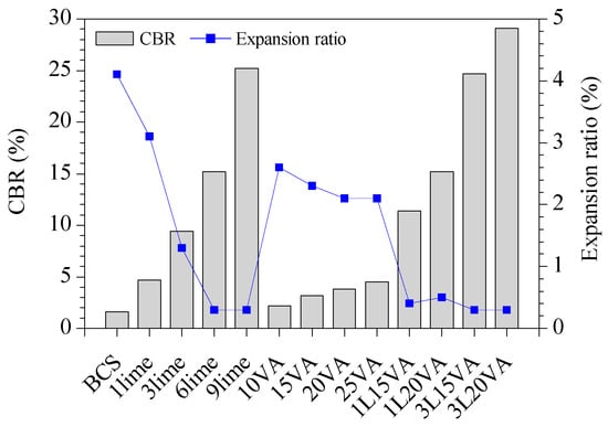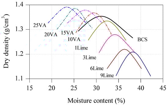 Table 3 presents the liquid limit, plastic limit, and plasticity index of the stabilized BCS. The lime-stabilized BCS presents a marginal decrease in liquid limit, which decreased from 64.3% to 58.3% on the addition of 9% lime. However, the liquid limit of BCS stabilized with VA, and combined additives presented a rapid decrease with increasing additive content. With the addition of 25% VA and the combination of 3% lime + 20% VA, the liquid limit of the stabilized BCS decreased from 64.3% to 51.6 % and 46.6%, respectively. Similar behavior was observed by Al-Rawas et al. [] using lime, cement, and artificial pozzolan as soil additives. However, lime-stabilized BCS presented an obvious decrease in plasticity index due to the increase of the plastic limit. The plasticity index of lime-stabilized BCS decreased from 30.7% to 8.3% on the addition of 9% lime. The plasticity indices of BCS stabilized with 25% VA and the combination of 3% lime + 20% VA were 22.7% and 22.2%, respectively.