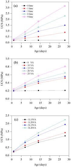 The increase in the UCS of the stabilized BCS following the increase of stabilizer dosage and curing time is shown in Figure 5. Lime-stabilized BCS presents a prominent increase in UCS. Lime increases the UCS of BCS from 0.215 MPa to 2.2 MPa and 3.5 MPa with the additions of 6% and 9%, respectively. This behavior is attributed to the reactions between the soil and lime, including cation exchange, flocculation, carbonation, and pozzolanic reaction. The use of VA shows poor results when compared with lime. Even when 25% VA was added, the UCS of VA-stabilized BCS only increased from 0.215 MPa to 0.81 MPa after 28 days of curing. Low pH can be observed in the VA-stabilized clay [], the few hydroxyl ions (OH−) provided by VA-soil mixes lead to slow progress of the pozzolanic reaction, and a low UCS was observed in VA-stabilized BCS.