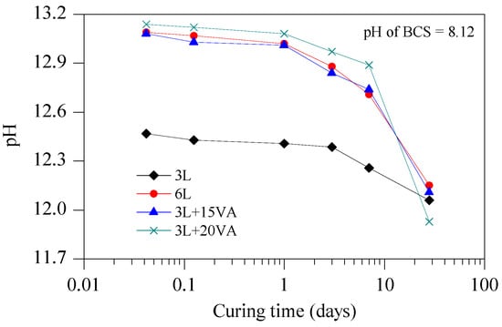 Variation of pH in stabilized BCS with curing time.