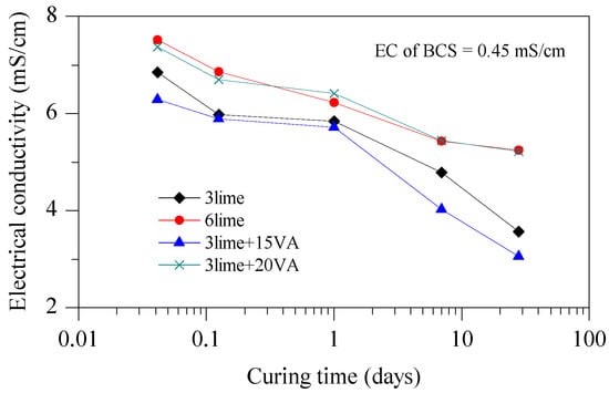 The variation of electrical conductivity (EC) with stabilizer dosage and curing time is shown in Figure 7. The increase in EC of the stabilized BCS indicates the increase of exchangeable cations in the stabilizers–soil mixtures due to the dissolution of VA and lime in the stabilized soil, which can accelerate cation exchange between the calcium cation of the stabilizers and the cations absorbed on the surfaces of BCS particles. The effect of this process results in the closeness of soil particles and the improvement of the physical–mechanical properties of the BCS. The EC of stabilized BCS suffers a sharp reduction during the initial stage due to cation exchange, followed by a slow decrease due to the consumption of cations and hydroxide ions for the pozzolanic reaction.