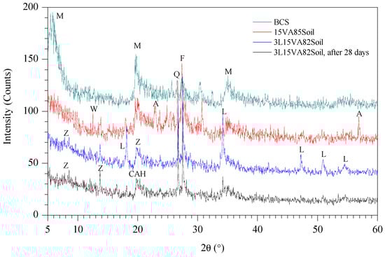 X-ray diffraction of unstabilized and stabilized BCS. (Annotations show M = montmorillonite, Q = quartz, F = feldspar, A = augite, Z = zeolite, W = wollastonite, L = lime, and CAH = calcium aluminate hydrate).