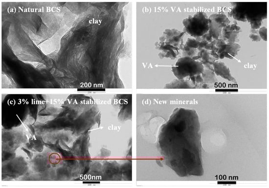 Figure 9 presents the TEM images of natural BCS, stabilized BCS with 15% VA, and stabilized BCS with 3% lime + 15% VA. Multilayer sheet structures, which are the typical morphology of clay minerals, are observed in the natural BCS []. This illustrates that clay minerals are the major components in BCS, which is consistent with the XRD results. The block-shaped particles found in the VA-stabilized BCS are ascribed to VA. The coexistence of BCS and VA can explain the poor effect of VA on the physical–mechanical properties of the BCS. After 28 days of curing, sheet structures can still be found in the 3% lime + 15% VA-stabilized BCS. However, the corrosion of such sheet structures and the appearance of the new small particles illustrates the decrease of the clay minerals and the formation of new minerals.