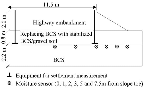 Schematic diagram of the field test replacing BCS with 3% lime + 15% VA-stabilized BCS/gravel soil.