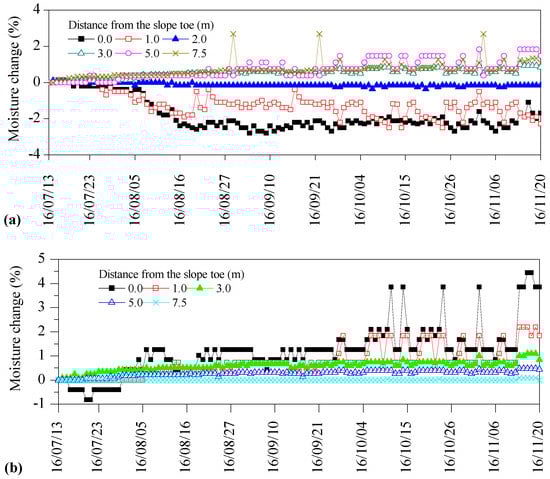 Moisture change in foundation BCS with time during the period July 2016–November 2016. Replacement of BCS with (a) soil stabilized with lime and natural pozzolans and (b) gravel soil.