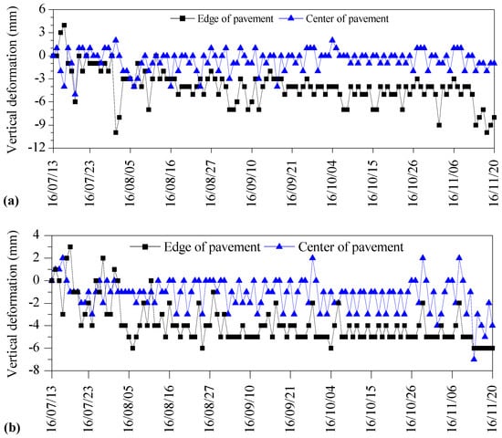 Vertical displacement of the BCS foundation during the period July 2016–November 2016. Replacement of BCS with (a) soil stabilized with lime and natural pozzolans and (b) gravel soil.