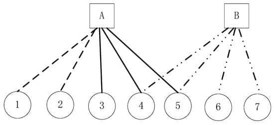 When the set of nodes that meet these two conditions, we call it an application community (here in after referred to “the community”). In Figure 1, Servers A and B provide different services. Clients 1–7 and Servers A and B communicate based on the connection. The line type is used to indicate different data transmission behaviors. According to the above description of communities, the nodes in the graph can be divided into three communities, namely {A, 1, 2}, {A, 3, 4, 5}, and {B, 4, 5, 6, 7}. Among these, Servers A and B are leader nodes determining the community type, and Clients 1–7 are member nodes that communicate with the leader nodes to obtain a certain service. Although {1, 2, 3, 4, 5} communicates with the A node, {A, 1, 2} and {A, 3, 4, 5} do not belong to the same community because {1, 2} and {3, 4, 5} differ in data transmission behavior. The difference in data transmission behavior may because that (1) Server A provides multiple services at the same time or (2) Client {1, 2} or {3, 4, 5} access the server in an unconventional manner. Using the method proposed in this paper, one can identify different communities when (1) the same node participates in different applications, and (2) the same service node provides normal services or is attacked.