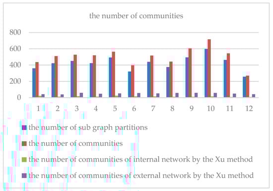 To illustrate the effectiveness of our method, we use the method proposed in Xu et al. [11] to identify the same data. Since the Xu method uses a single-mode projection for the bipartite graph in community identification, it can only identify communities from one side of the network at a time. We use the community detection algorithm in Xu et al. [11] for the internal and external IPs in the enterprise network; the results are shown in Figure 4. The results show that for the same dataset the number of communities identified by our method is much larger than that obtained by Xu’s method. Through further analysis of the results, we found that Xu’s method does not distinguish between different data transmission characteristics (such as the DDos attack situation) in the same communication relationship. Moreover, the communities identified by Xu’s method do not have a service node (leader node). Thus, it is difficult to visualize the characteristics of the communities. Our method takes into account the communication relationship and data transmission characteristics when identifying the communities and retains the leader nodes in the communities. These help to more accurately identify and research the communities. This is the advantage of our method compared with existing research methods.