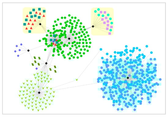 We used the Cytoscape method [29] to visualize some typical communities in the community detection results. The nodes represent the <IP, Port>, and connections represent the communication relations between nodes. Nodes are represented in different shapes according to the community which they belong to. The morphology of the community is shown in Figure 5, and the following phenomena can be observed by analyzing the community.