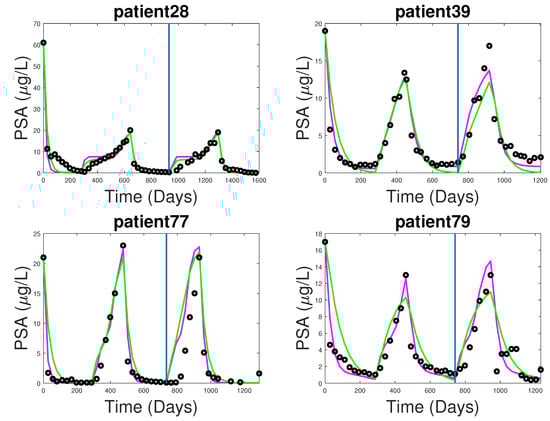 The data is taken from a clinical study from the Vancouver Prostate Center [19]. Similar to [18], we select 26 patients with sufficient data for fitting and forecasting comparisons, over 2.5 cycles of treatment.