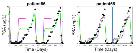 Different patients react differently to the treatment, especially during the first cycle of treatment—the time for PSA to fully relapse varies between patients. Figure 3 shows an example where PSA level takes over two years to reach the upper PSA threshold. Recall that our fitting scheme utilizes a fixed exponential weight that works well for most patients, but fails in this case due to the abnormally long time it takes PSA to relapse (left figure). This indicates that our choices of and are not suitable for this particular case. As a counter-example, by reducing the exponential weight and readjusting the contribution of errors from each section of data (e.g., adjusting to , , and ), the fitting and forecasting results significantly improve (right figure).